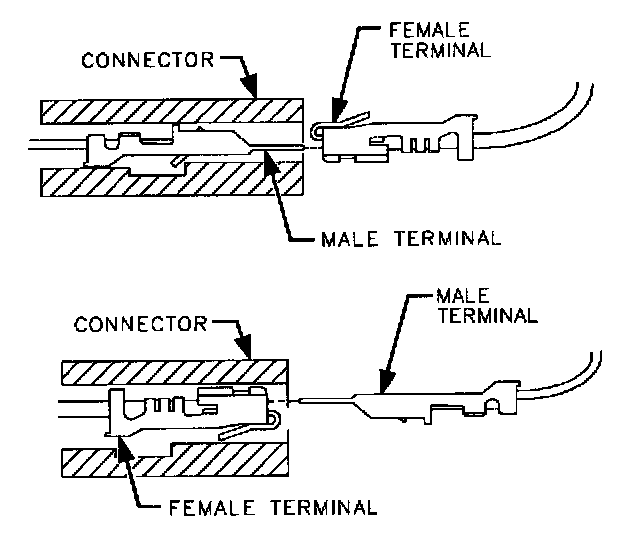 The second function is to determine if a terminal's contacts have been spread apart, resulting in an open or intermittent open. This is known as a terminal tightness test. Connector terminals make contact with the pin by means of a tang which is sprung against the pin. If the tang is spread apart by a meter probe, the tang will not spring back to tightly grip the pin. Test this by inserting the jumper pin and removing it, noting how well the terminal holds the pin. It should be held well enough that the pin will not fall out of the terminal.