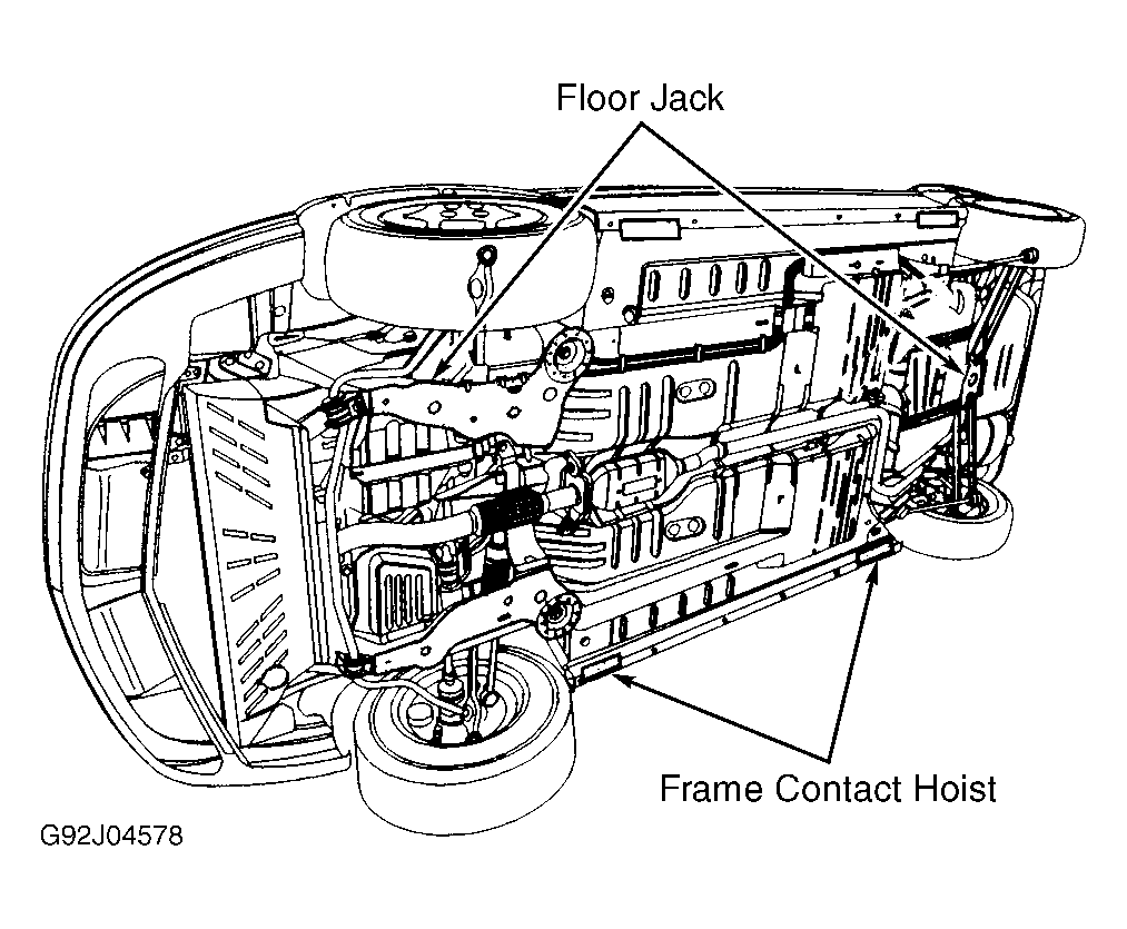 Floor jack may be used at locations shown in illustrations to raise vehicle. See Fig 1 . Floor jack lifting points are located at center of front crossmember (inboard) and center of rear axle.