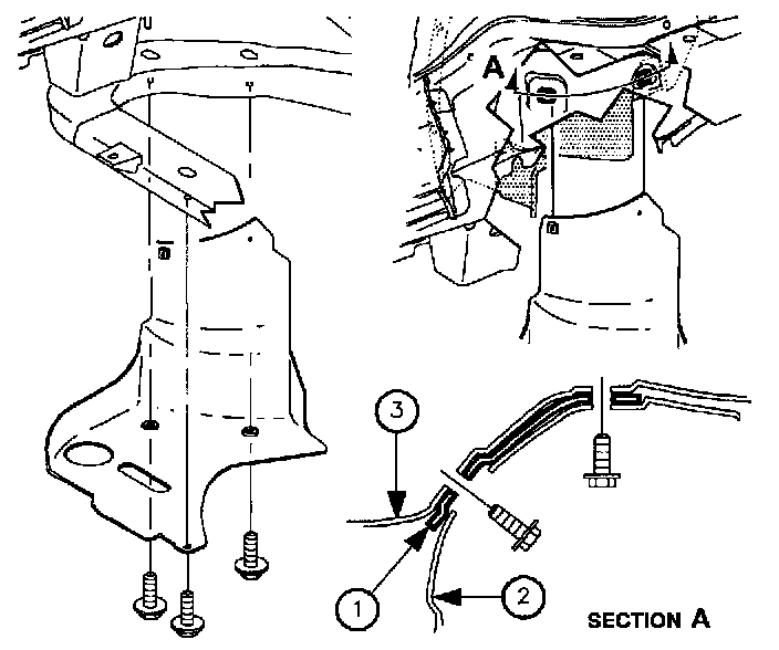 10. Install lower cradle splash shield by sliding shield (1) between wheelhouse liner (2) and wheelhouse (3). Install splash shield to wheelhouse and cradle fasteners.