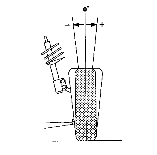 Caster is a measure of the angle between the steering axis and vertical when viewed from the side of the vehicle with the wheel in the straight ahead position. The steering axis is determined by the location of the lower control arm ball joint and the center of the strut-to-body attachment. A line drawn through the center of the ball joint and the strut-to-body joint represents the steering axis. When the center point of the strut-to-body attachment is rearward of the ball joint, the caster is positive. When the center of the strut-to-body attachment is forward of the ball joint, the caster is negative.