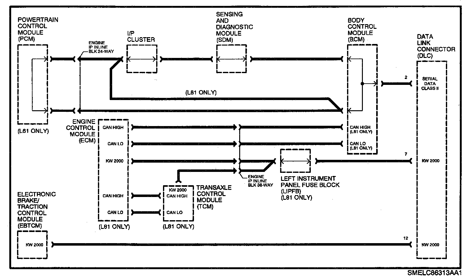 The engine and transaxle are controlled by a powertrain control module which communicates on the Class II link. Also, the electronic brake/traction control module (EBTCM) communicates over a KW 2000 data link, but on a separate wire.