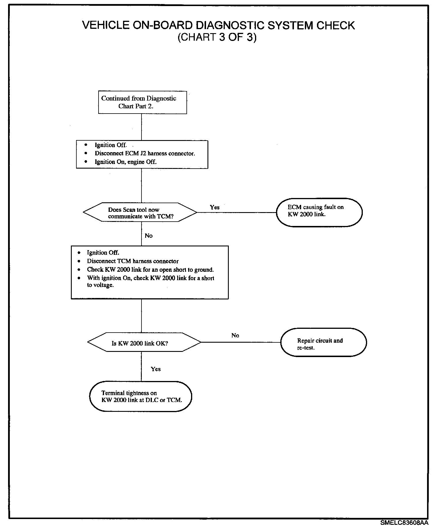 The BCM did not indicate any DTCs relating to the ECM or TCM up to this point in the "Vehicle On-Board Diagnostic System Check." Since the Scan tool cannot communicate with the ECM or TCM, this chart will diagnose faults associated with the KW 2000 data link.