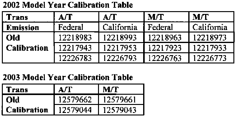 Step 3 applies only to 2002 and certain 2003 model year vehicles, as indicated in step 3. Using a portable scan tool, check current PCM calibration ID. Refer to 2002 or 2003 Model Year Calibration Table, as appropriate.