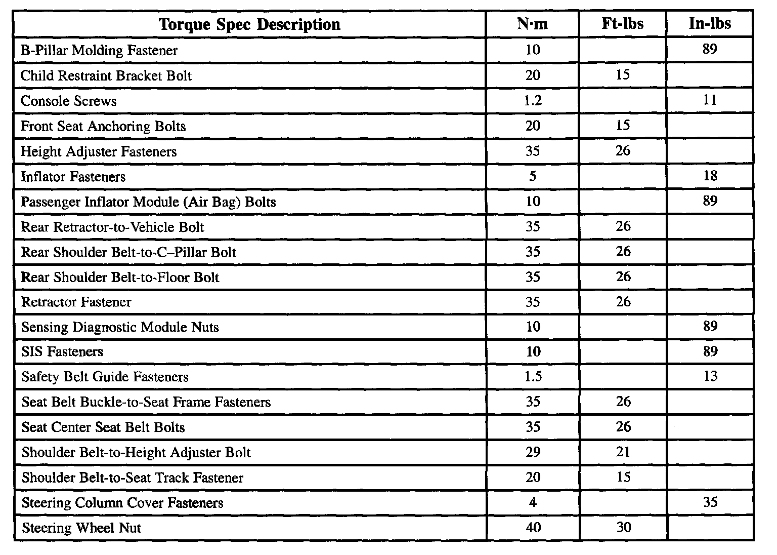 Restraint Torque Specifications: