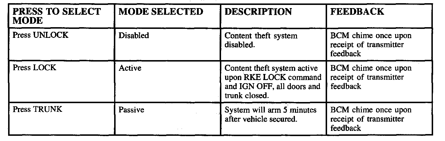 Passive-Content theft system will arm 5 minutes after ignition is Off, all doors and trunk are closed. Any door open will reset 5 minute timer.