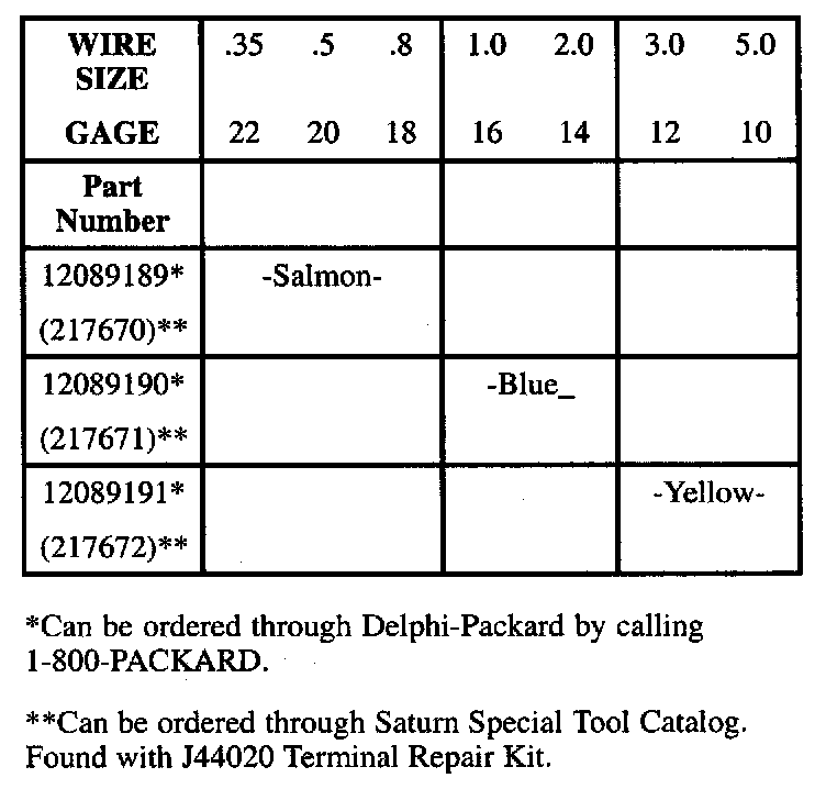 With the low current and voltage wires in the Saturn vehicle, it is best to use approved Packard Electric Crimp and Seal Splice Sleeves (or equivalent).