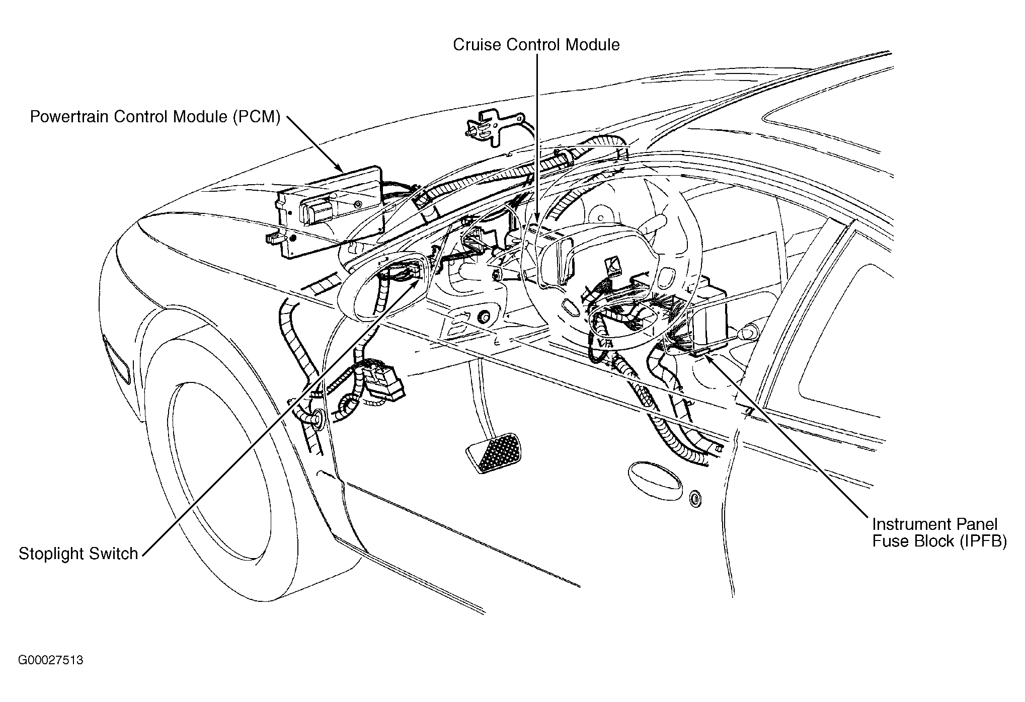 | Powertrain Control Module (PCM) | Between battery & power brake booster. See Figure. |