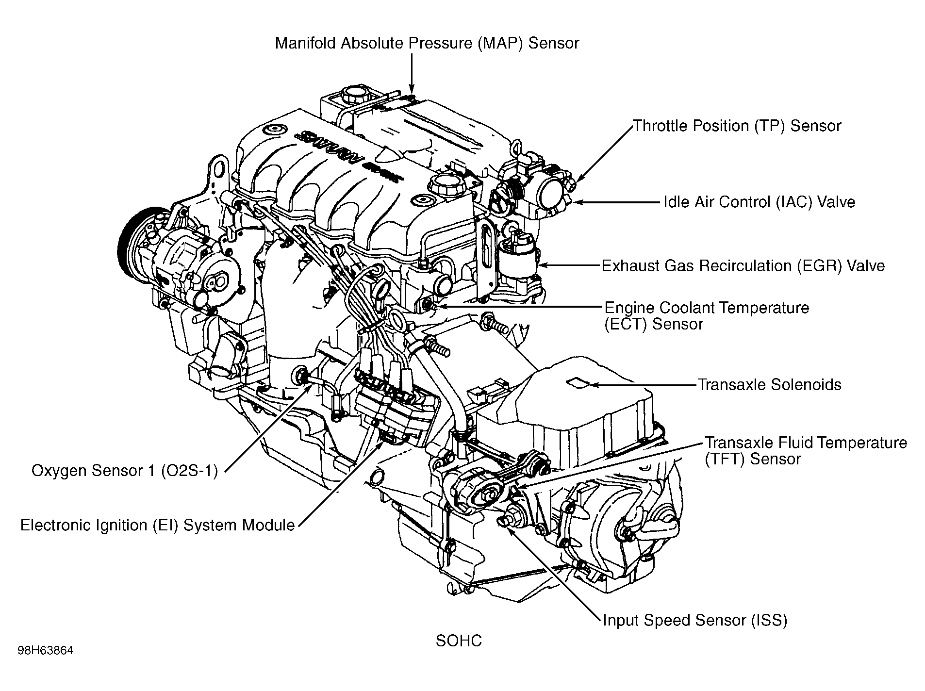 | Electronic Ignition (EI) System Module (SOHC) | On left front side of transaxle housing. See Figure. |