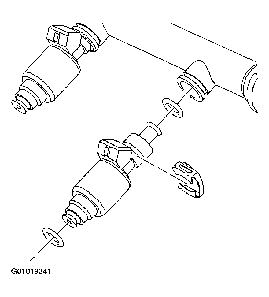 - Slide fuel injector retainer clip off fuel injector. See Figure