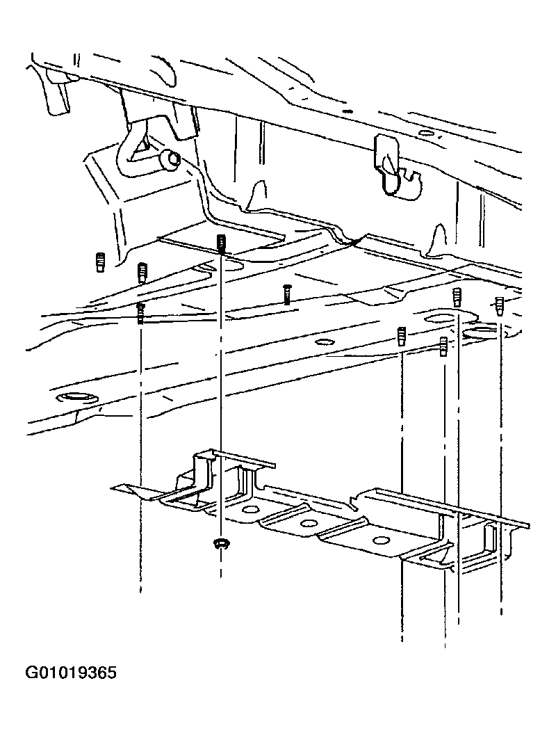 - Reposition fuel tank mounting straps and shield around tank and install strap mounting bolts to underbody. Tighten fuel tank mounting strap to 20 N.m (15 ft-lbs).