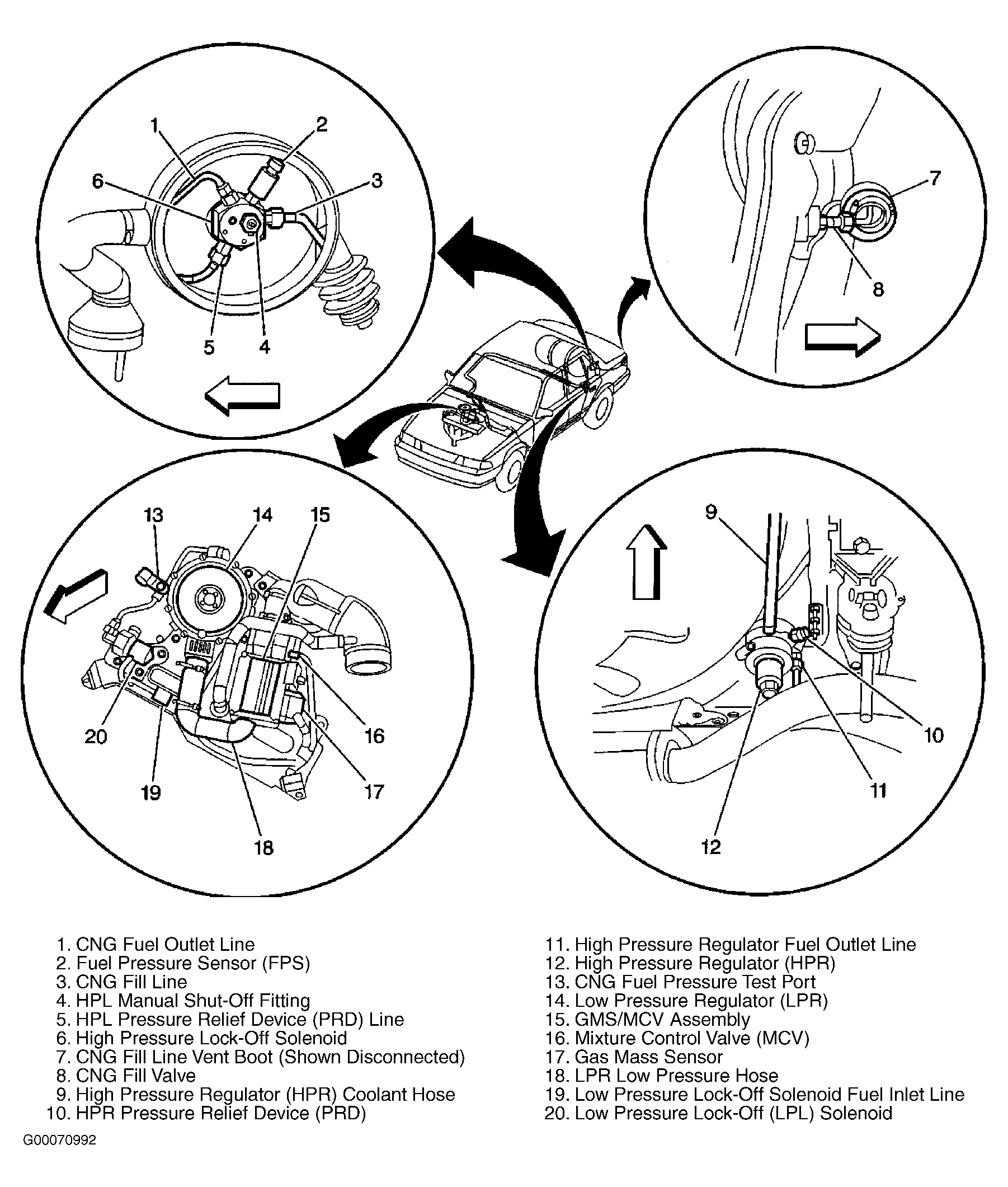 - Turn ignition off. Remove LPR primary test port plug. See Fig 1. Connect pressure gauge adapter to LPR primary test port. Connect 0-15 PSI Pressure Gauge (J 28552) to adapter. Observe pressure while cranking engine. If a DTC sets that forces a switch-over to gasoline operation (for example: DTC P1202), fuel pressure can only be monitored before DTC sets. If vehicle will not idle in CNG mode, note pressures during cranking and go to next step. If vehicle will start and idle, run until operating temperature is reached. Record pressure while engine is idling. Observe and record pressure while performing the following procedures: