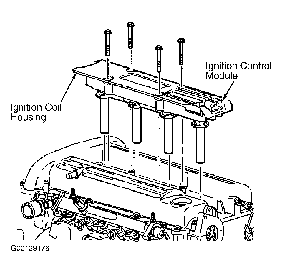 The Ignition Control Module (ICM) is located in a housing in the camshaft cover. See Figure. Turn ignition off. Disconnect negative battery cable. Remove the accelerator cable from the bracket. Remove the accelerator cable bracket bolt. Remove the accelerator cable bracket. Disconnect the ICM harness connector. Remove the ICM retaining screws. Remove the ICM from the ignition coil housing. To install, reverse removal procedure. Tighten retaining screws to specification. See TORQUE SPECIFICATIONS .