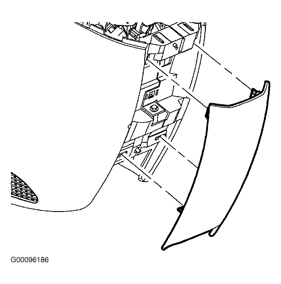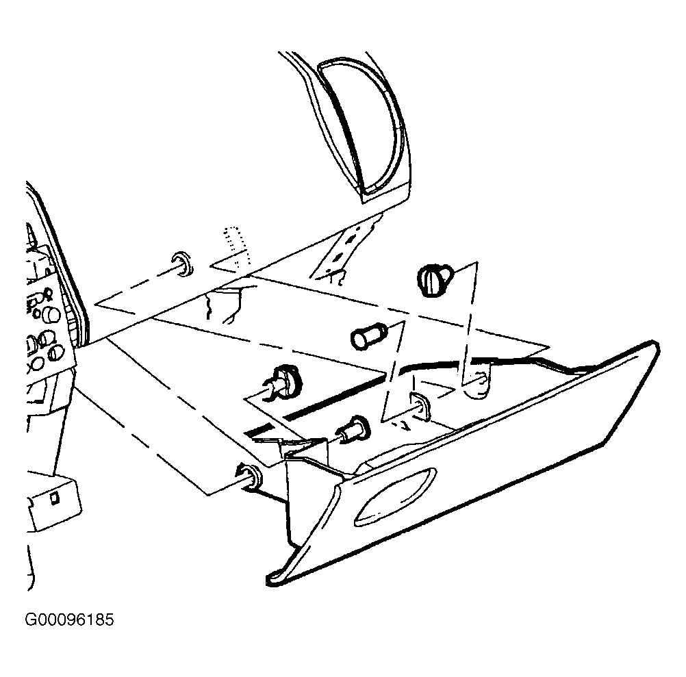 - Install instrument panel compartment door stops by inserting with 1/4 turn to lock into position. Install knee bolster by aligning retention clips with corresponding slots in retainer and snapping into place by applying light force at clip locations. See Fig 4