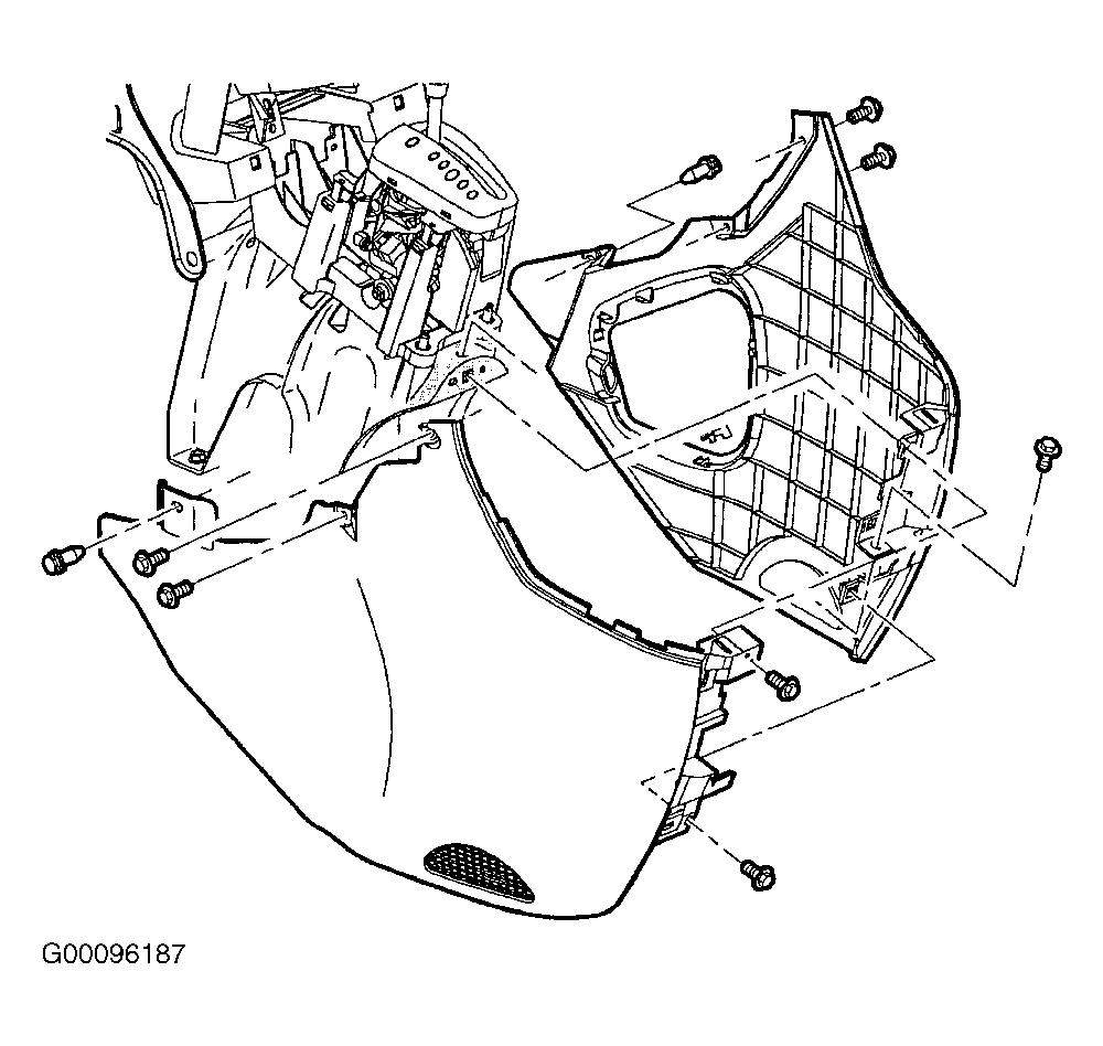 - Install right trim panel and align left trim panel over alignment pins in right trim panel. Install screws. Install panel-to-HVAC module push pin and panel-to-instrument panel retainer screws. See Fig 6