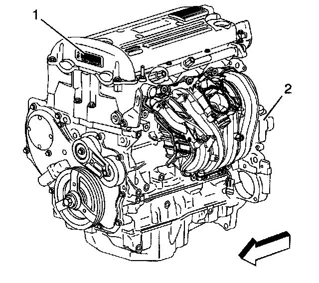 Engine IdentificationIdentification can be made through the use of the Broadcast Code label on the engine front cover (1) and the use of the partial VIN etched on the oil filter bowl (2).