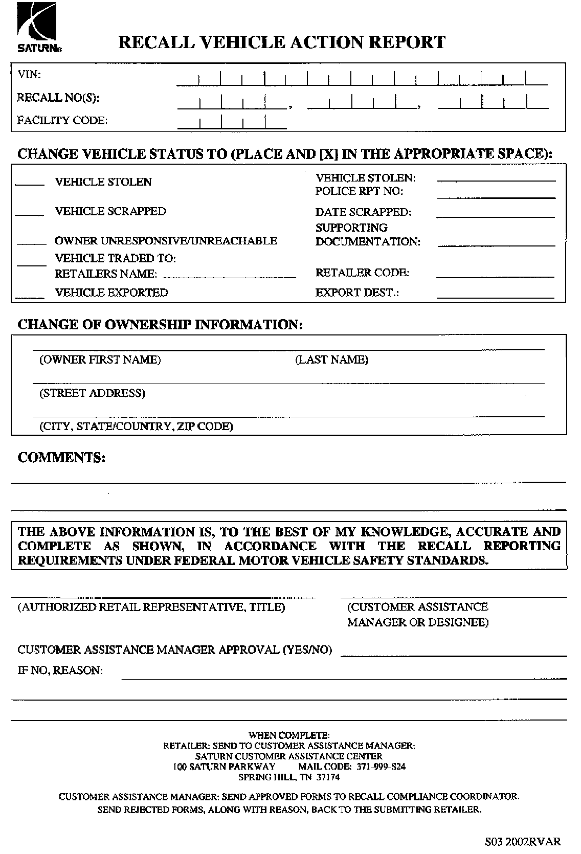 A copy of the Recall Vehicle Action Report is shown for your reference Additional copies can be ordered from Saturn Publications (1-800-828-2112, prompt 3, Item H S03 2002RVAR). All changes to recall responsibility will be reflected in your next Unfixed VIN Report.