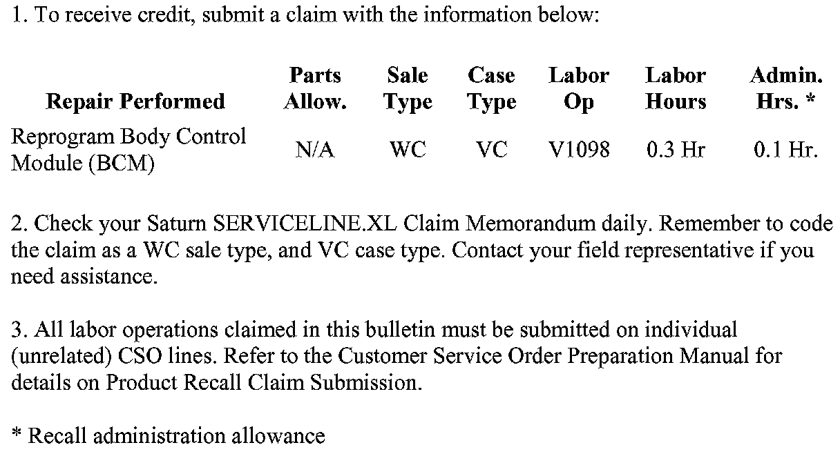 ^ Submit a Recall Vehicle Action Report to your Customer Assistance Manager (CAM) at the Saturn Customer Assistance Center.