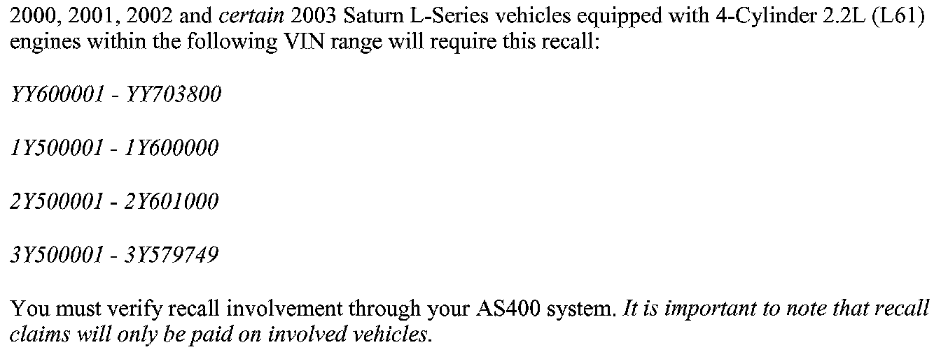 Owners of all involved vehicles will be notified of this recall by Saturn at a later date. (Refer to the owner letter shown in this bulletin)