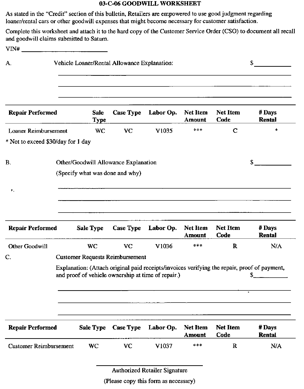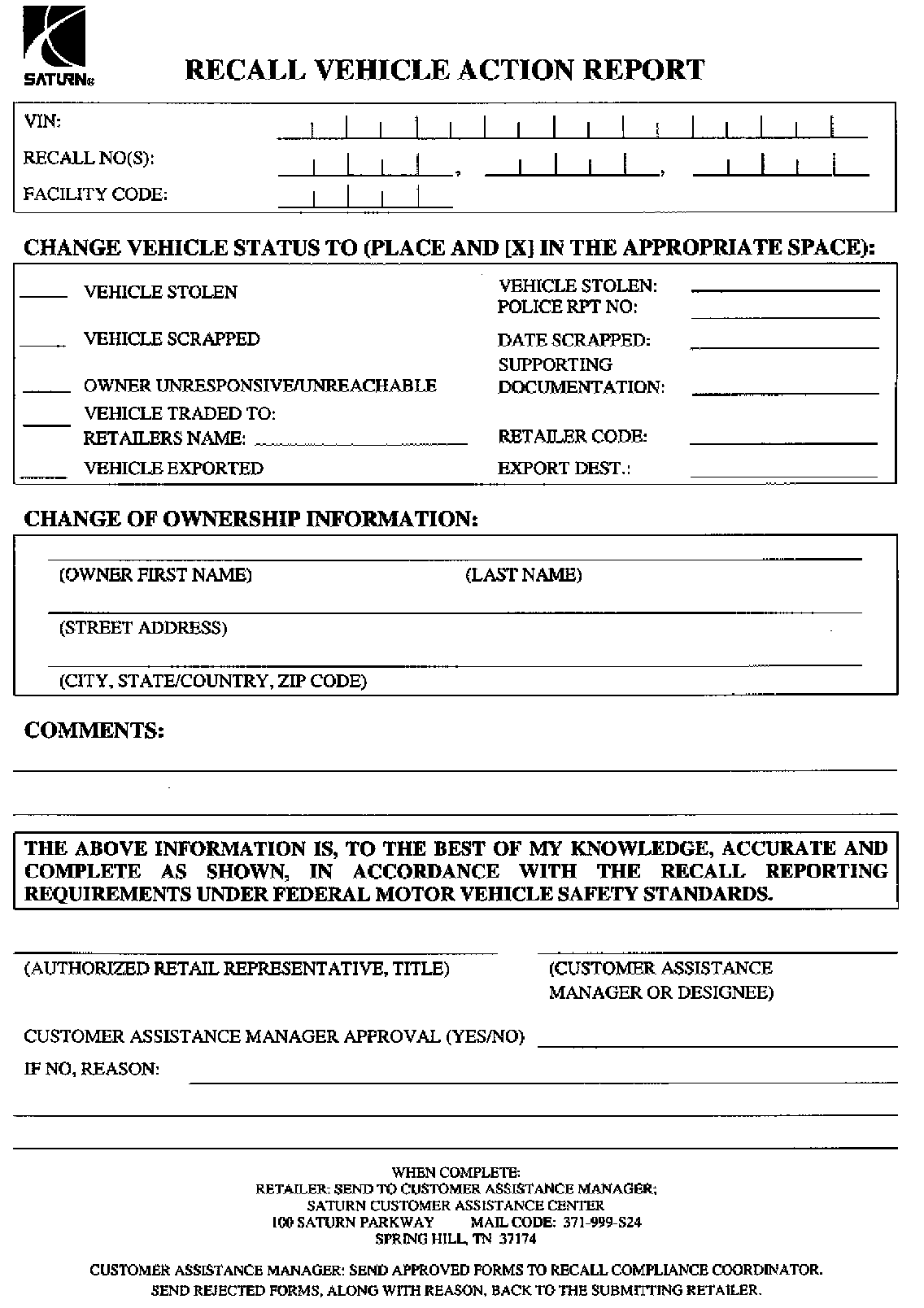 ^ Submit a Recall Vehicle Action Report to your Customer Assistance Manager (CAM) at the Saturn Customer Assistance Center.