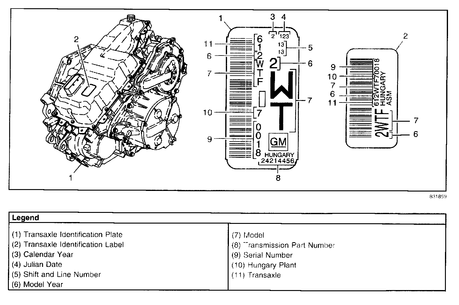 To properly identify the transaxle assembly model year, locate the model year number placement on the metal identification plate (1) and on the identification label (2). The transaxle model year is identified as callout number 6 on the illustration and legend. A number "2" in this position indicates model year 2002. A number "3" indicates model year 2003. A number "4" indicates model year 2004.