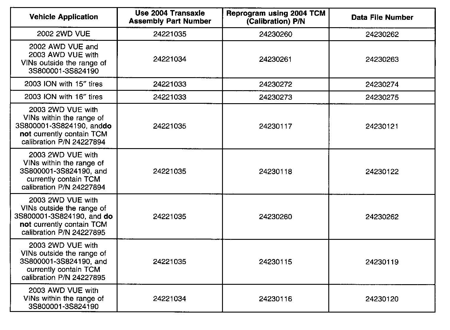 When replacing a 2002 or 2003 model year VT25E transaxle assembly with a 2004 model year VT25E transaxle assembly, it is necessary to reprogram the TCM using 2004 model year software and calibrations. The software between the model years is neither compatible nor interchangeable. Use the Reprogramming Guide below to determine the correct transaxle control module (TCM) software for a particular VUE or ION application. The guide also lists the applicable 2004 model year VT25E transaxle assemblies.