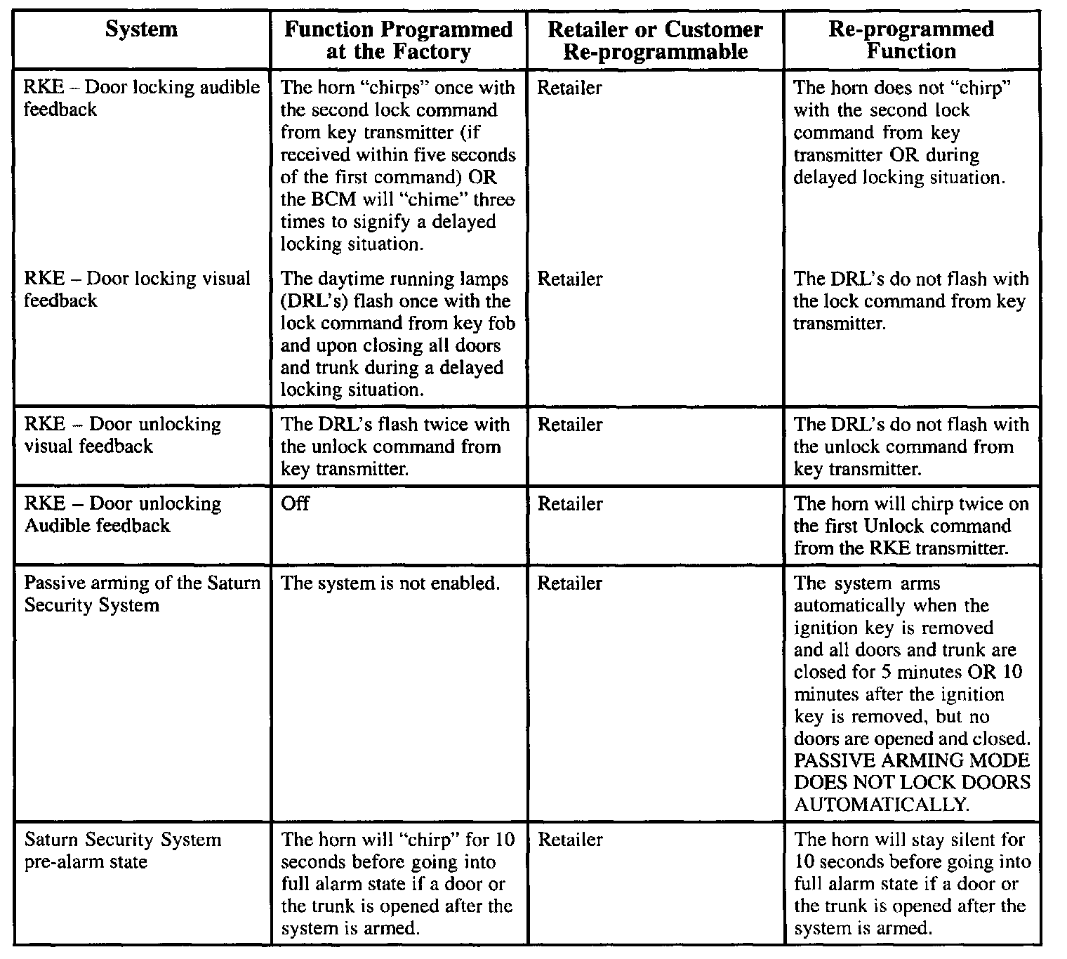 RKE Audible Programmable Features: