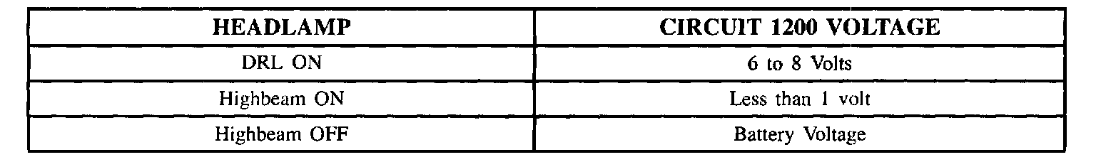 For DRL operation, the parking brake must be fully released, the ignition switch must be in the RUN position and headlamp switch must be in the Off position. Under normal operating conditions, the feedback voltage to the BCM measured at