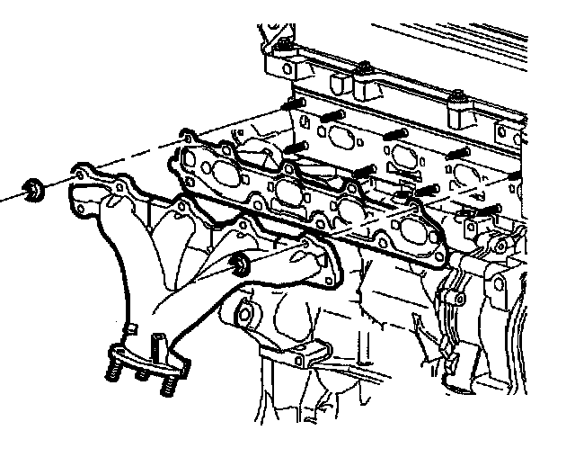 - Install exhaust manifold to cylinder head retaining nuts. Tighten nuts starting from the center and working outward.