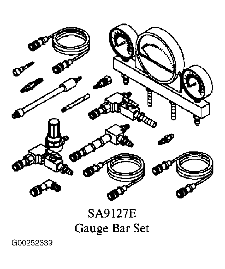Gauge Bar Set (SA9127E) and Fuel Pressure/Flow Adapter (SA9127E-7) are required to perform this procedure. See Figure