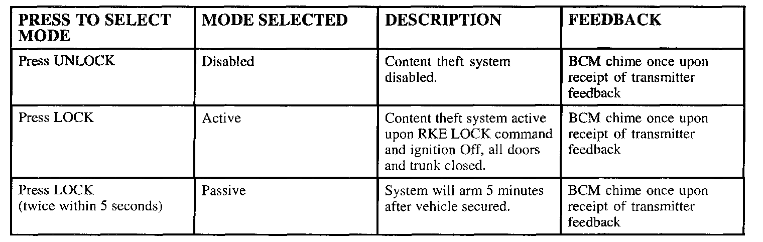 Active - Content theft system will only be armed by using the transmitter to lock the doors.