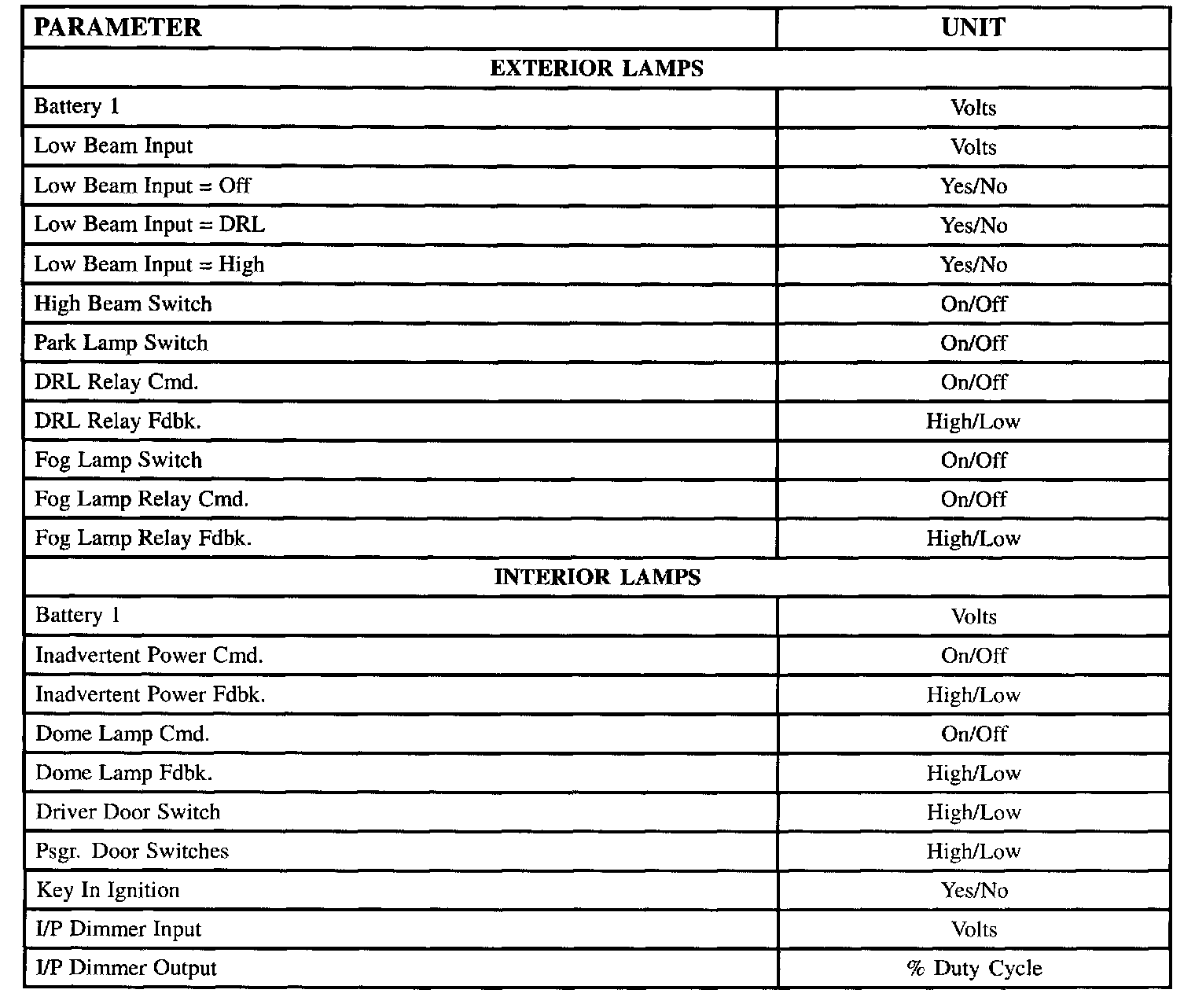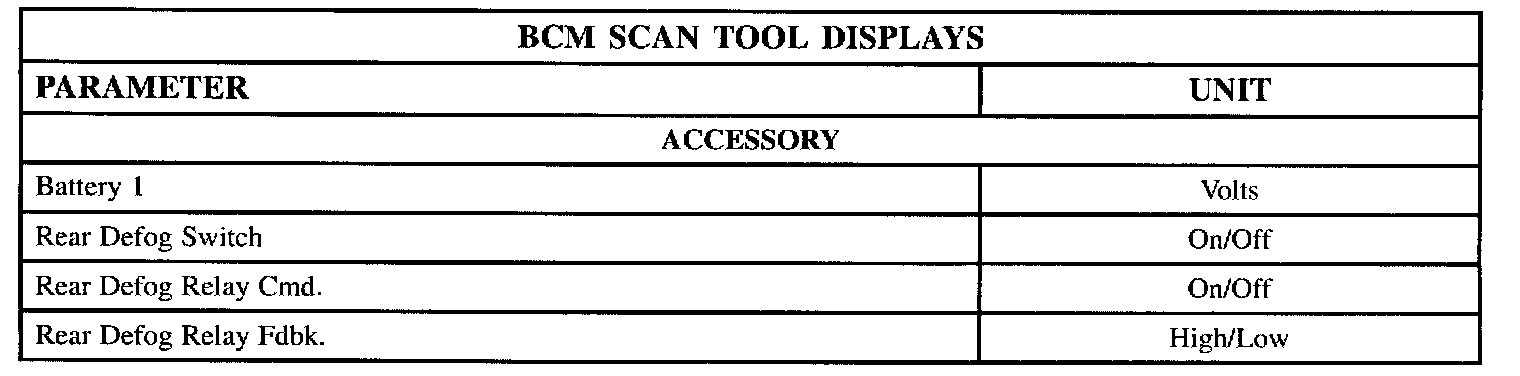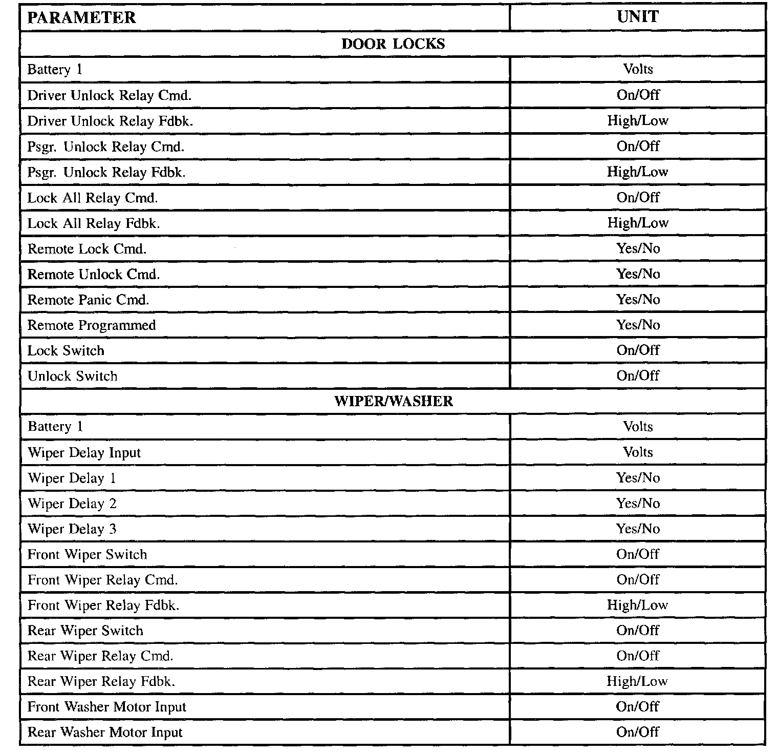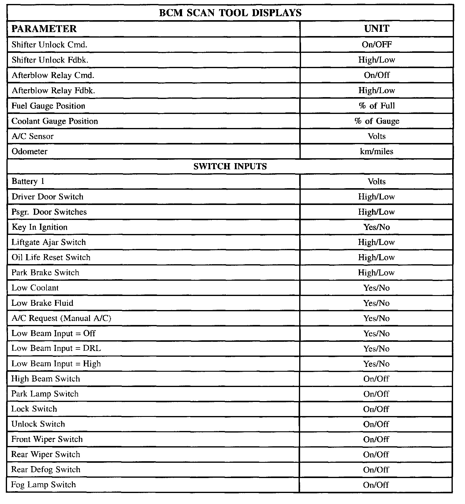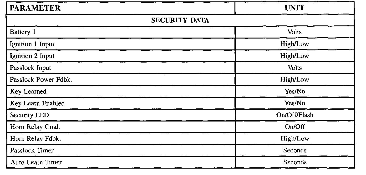 The tables lists the parameters displayed by the Scan tool. The parameters are displayed by ABS/TCS data, switch inputs, exterior lamps, interior lamps, door locks, wiper/washer and security data groups.
