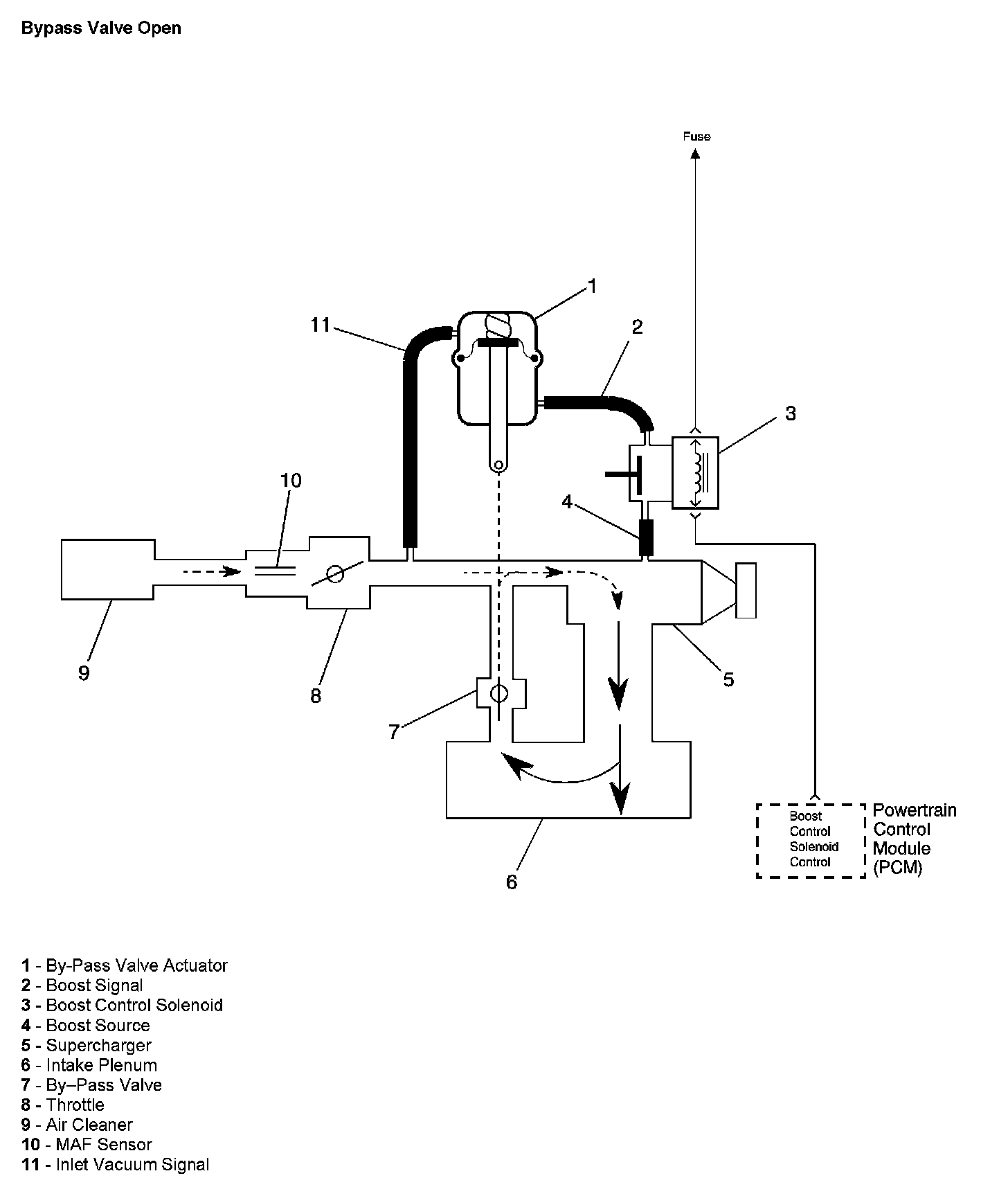 The PCM controls boost pressure by using the boost control solenoid. The boost control solenoid is normally an open valve. Under most conditions, the PCM commands the boost control solenoid to operate at a 100 percent duty cycle. This keeps the solenoid valve closed and allows only inlet vacuum to control the position of the bypass valve. At idle, engine vacuum is applied to the upper side of the bypass valve actuator, counteracting spring tension to hold the bypass valve open. As engine load is increased, engine vacuum is decreased, causing the spring in the bypass valve actuator to overcome the applied vacuum, closing the bypass valve and allowing the boost pressure to increase. The bypass valve starts to close when the vacuum measures 250 mm Hg (10 in Hg) and is fully closed at 90 mm Hg (3.5 in Hg). When reduced boost pressure is desired, the PCM commands the boost control solenoid to operate at a 0 percent duty cycle. This opens the solenoid valve and allows boost pressure to enter the bypass valve actuator at the lower side to counteract the spring tension, opening the bypass valve and recirculating excess boost pressure back into the supercharger inlet.