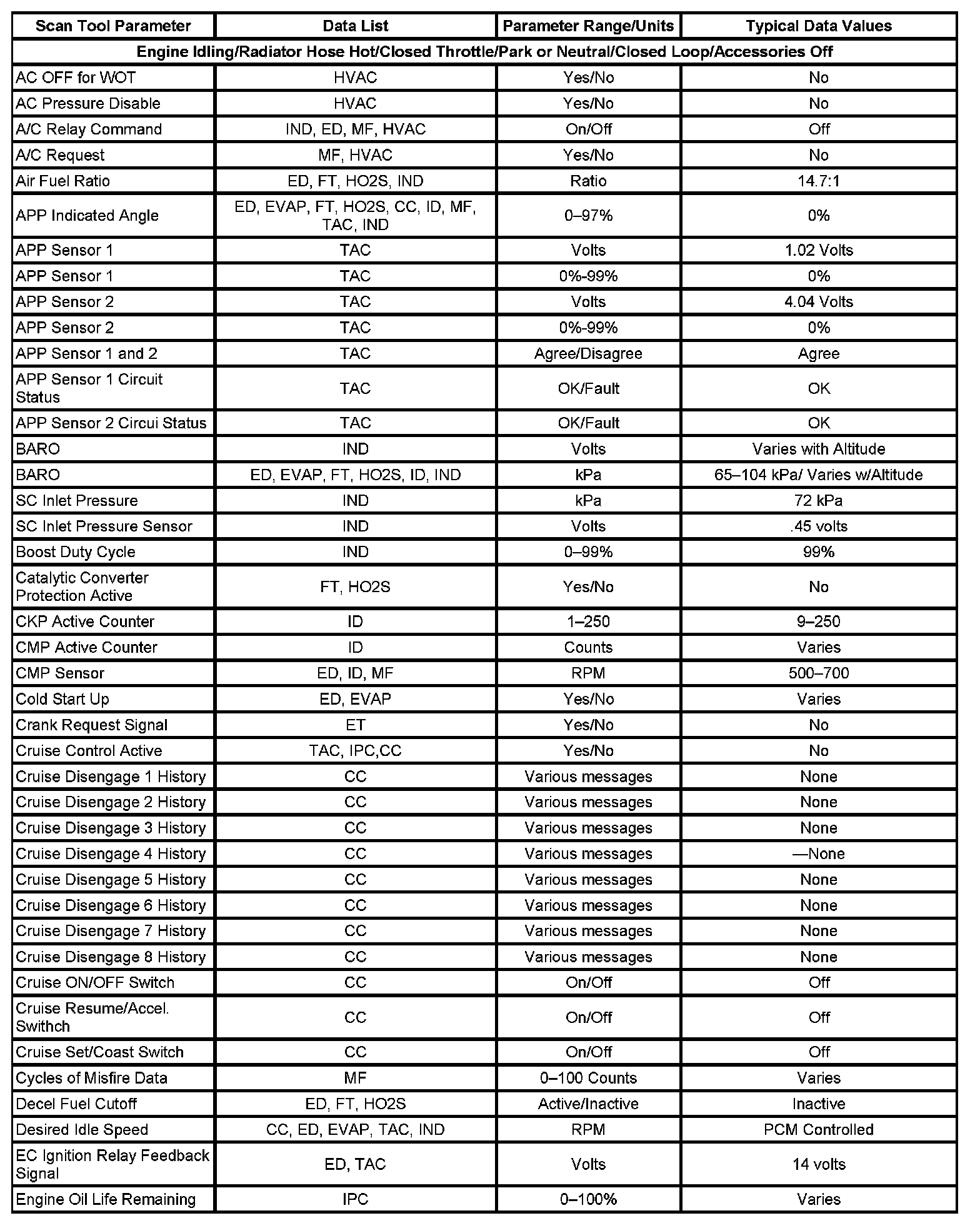 The Engine Scan Tool Data List contains all engine related parameters that are available on the scan tool. The list is arranged in alphabetical order. A parameter may appear in any one of the data lists, and in some cases may appear more than once, or in more than one data list in order to group certain related parameters together.