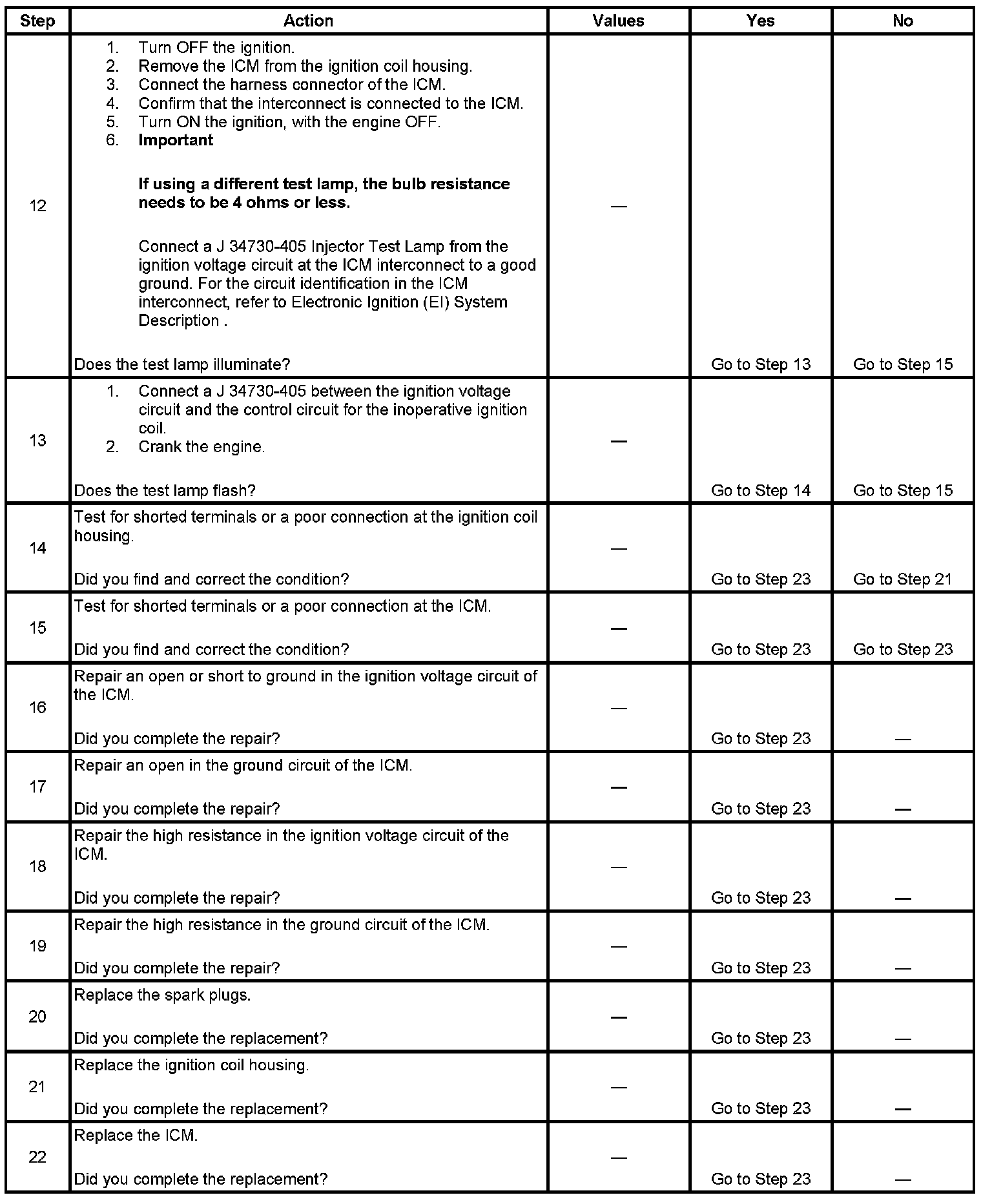 Each ignition coil supplies secondary voltage to a pair of spark plugs. This is called a waste spark ignition system. The engine control module (ECM) supplies a signal on each of the ignition control (IC) timing control circuits to the ignition control module (ICM). The ICM fires the correct ignition coil at the correct time based on the signals. The ICM detects if cylinder 1 or cylinder 3 is on the compression stroke by sensing the secondary voltage and polarity of each side of the ignition coil. The higher voltage is on the compressing cylinder. This is called compression sense ignition. The ICM provides a synthesized cam signal to the ECM based on these inputs. The ECM uses the cam signal to synchronize fuel injection. This system consists of the following circuits: