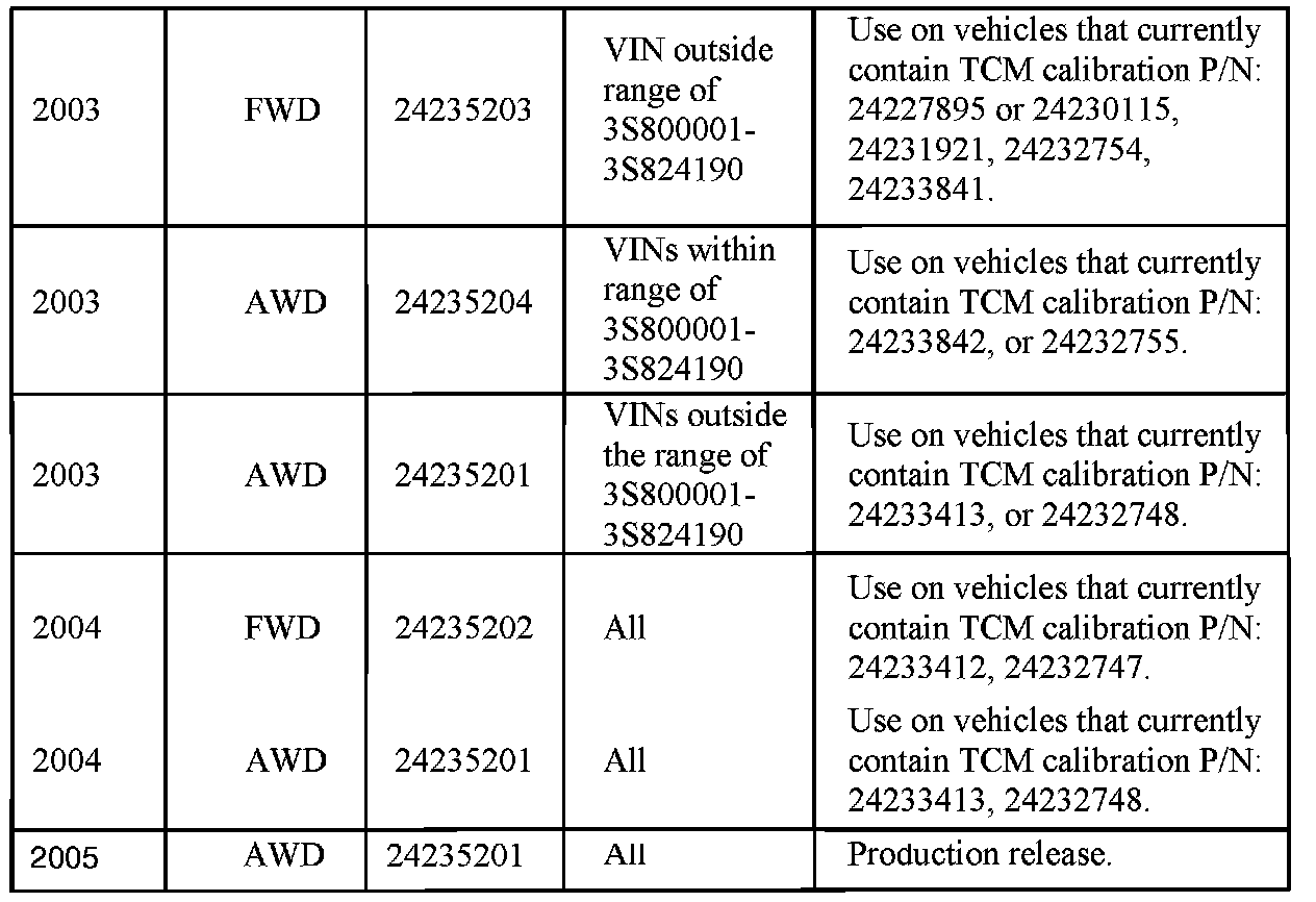 2. Program the TCM with new calibration. Refer to the calibration information table and select the appropriate TCM calibration for the application. Use Saturn Service Stall (SSS) software release TIS 2.5 2005 or higher data CD. For reprogramming procedures, refer to the Service Programming System (SPS) in the SSS Users Guide.