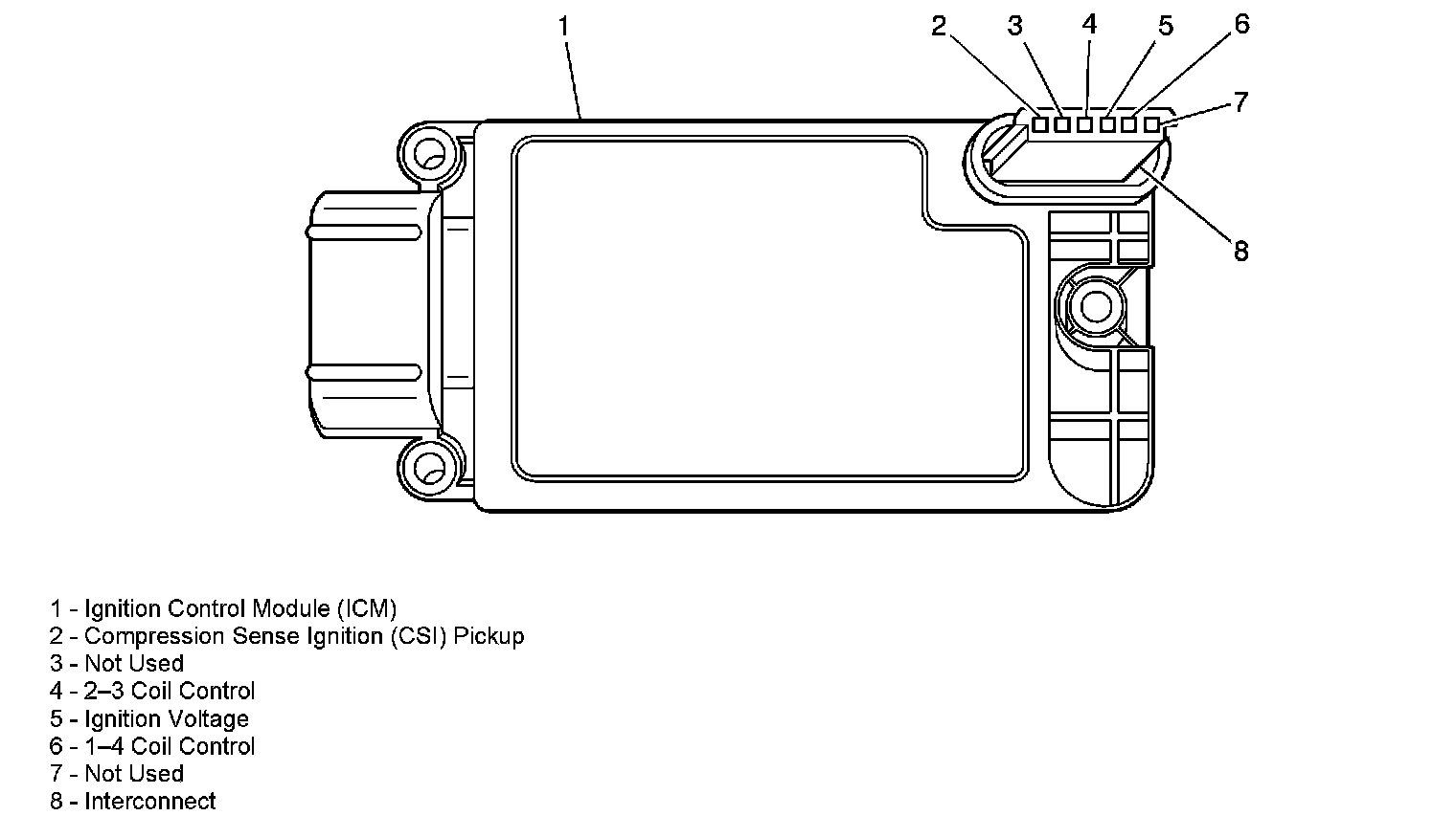 Each ignition coil supplies secondary voltage to a pair of spark plugs. This is called a waste spark ignition system. The powertrain control module (PCM) supplies a signal on each of the ignition control (IC) timing control circuits to the ignition control module (ICM). The ICM fires the correct ignition coil at the correct time based on the signals. The ICM detects if cylinder 1 or cylinder 3 is on the compression stroke by sensing the secondary voltage and polarity of each side of the ignition coil. The ICM detects this voltage with sensing circuitry integrated into each ignition coil. The higher voltage is on the compressing cylinder. This is called compression sense ignition. The ICM provides a synthesized cam signal to the PCM based on these inputs. The PCM uses the cam signals to synchronize fuel injection.