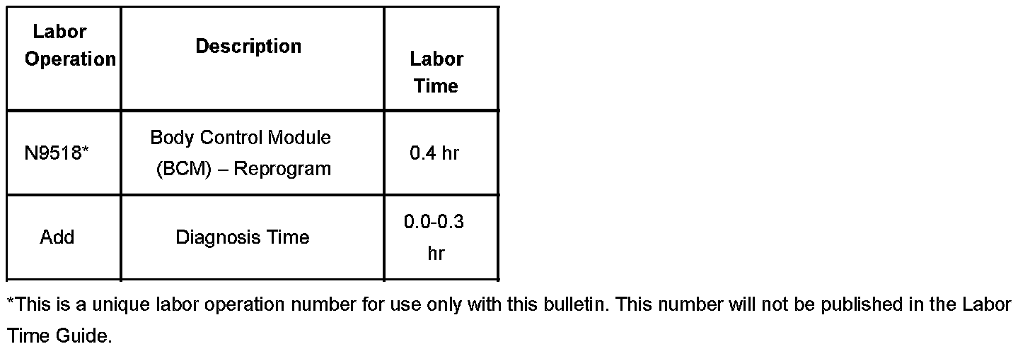 Technicians are to reprogram the BCM with an updated software calibration. This new service calibration was released with TIS satellite data update version 5.0 available May 5, 2005. As always, make sure your Tech 2(R) is updated with the latest software version.