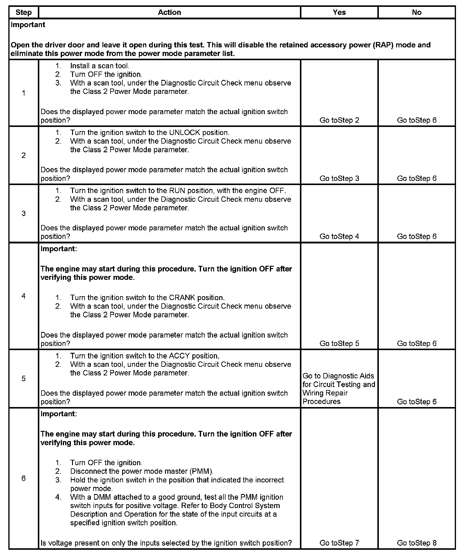 Normal vehicle serial data communications and module operations will not begin until the system power mode has been identified. Discrete wires from the ignition switch contacts are monitored by a module which acts as the power mode master (PMM) in order to determine the correct power mode. The module which is the PMM communicates the system power mode to all modules on the serial data lines. Refer to Body Control System Description and Operation to identify which module is the PMM and the applicable power mode look up table.