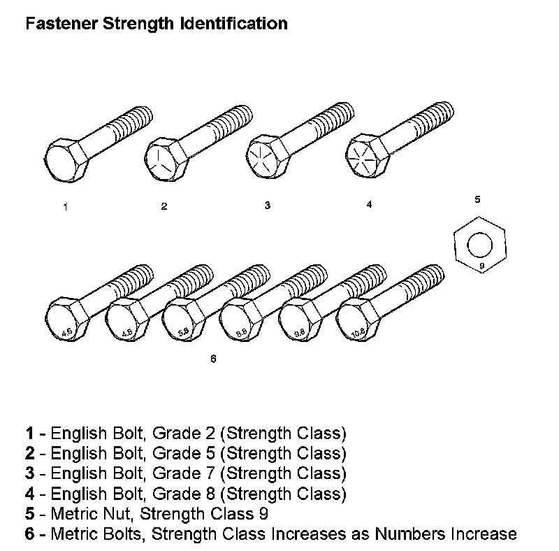 The most commonly used metric fastener strength property classes are 9.8 and 10.9. The class identification is embossed on the head of each bolt. The English, inch strength classes range from grade 2 to grade 8. Radial lines are embossed on the head of each bolt in order to identify the strength class. The number of lines on the head of the bolt is 2 lines less than the actual grade. For example, a grade 8 bolt will have 6 radial lines on the bolt head. Some metric nuts are marked with a single digit strength identification number on the nut face.