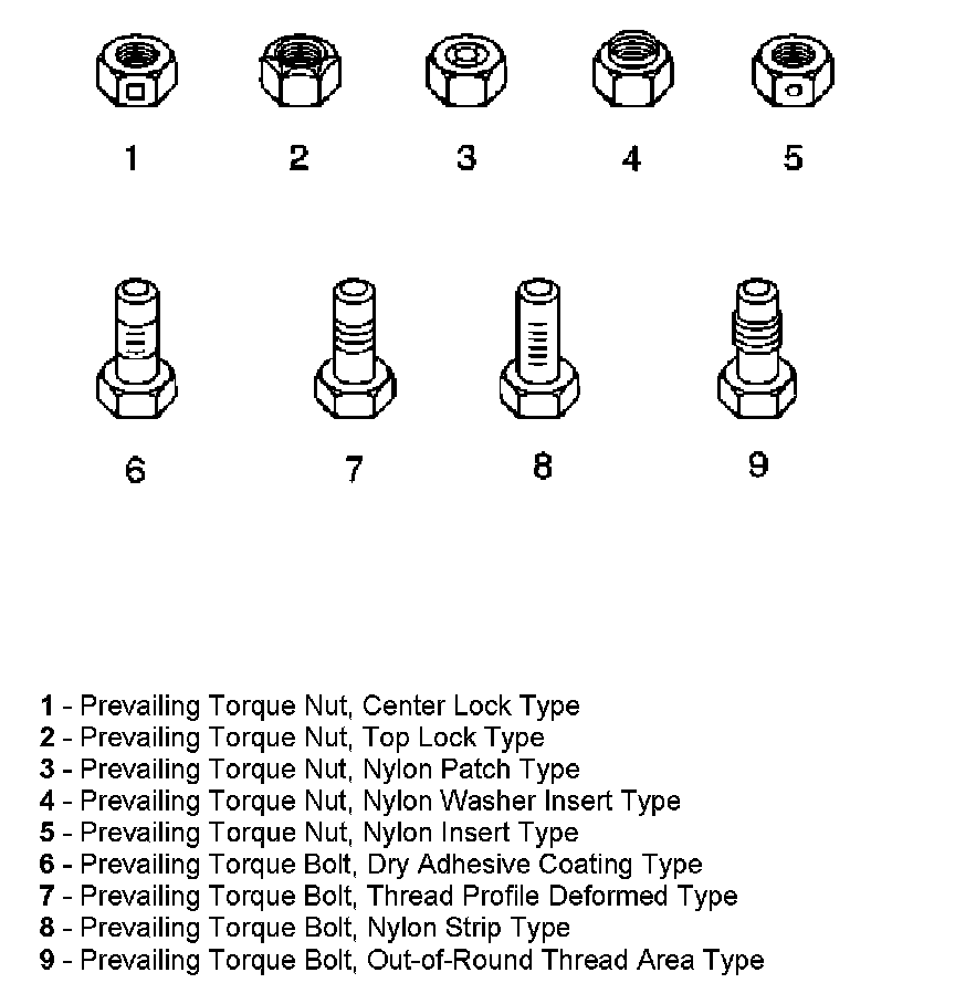 These fasteners accomplish the thread interface by the presence of a thread-locking compound on the fastener threads. Refer to the appropriate repair procedure in order to determine if the fastener may be reused and the applicable thread-locking compound to apply to the fastener.
