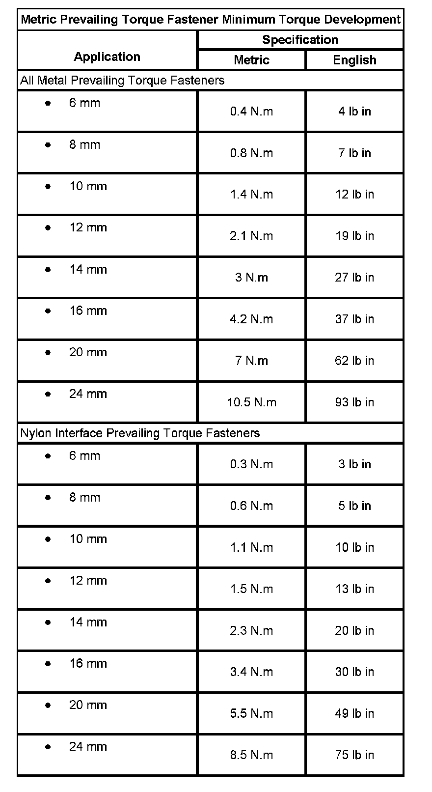 Metric Prevailing Torque Fastener Minimum Torque Development: