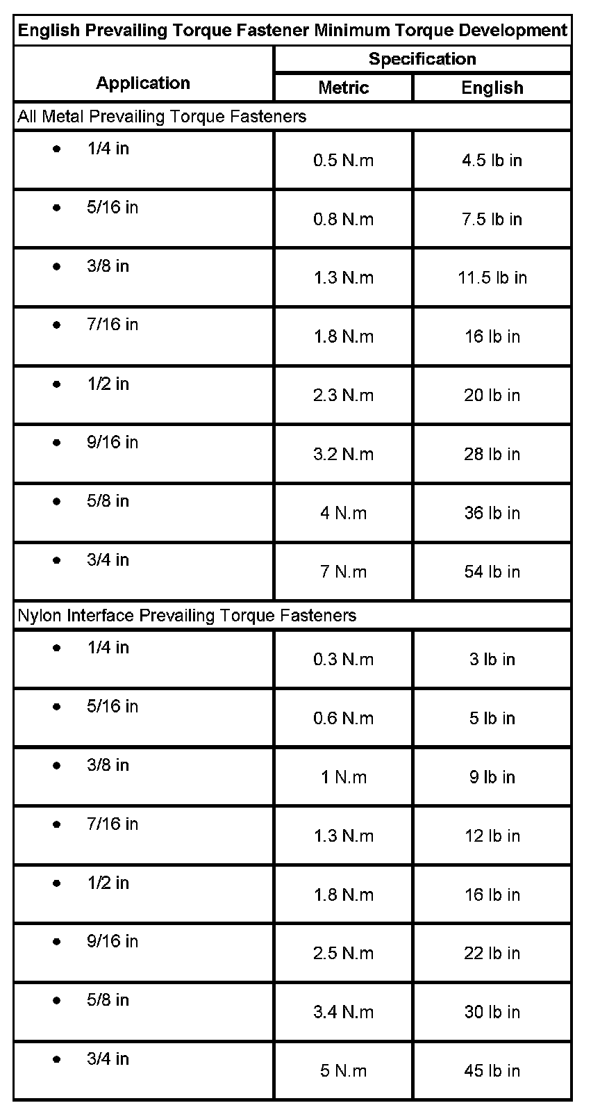 English Prevailing Torque Fastener Minimum Torque Development: