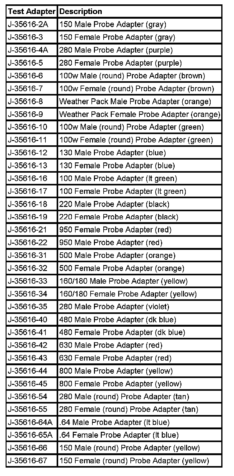 When using the J 35616 GM-Approved Terminal Test Kit, ensure the terminal test adapter choice is the correct size for the connector terminal. Do not visually choose the terminal test adapter because some connector terminal cavities may appear larger than the actual terminal in the cavity. Using a larger terminal test adapter will damage the terminal. Refer to the J 35616 GM-Approved Terminal Test Kit label on the inside of the J 35616 GM-Approved Terminal Test Kit for the correct adapter along with the connector end view for terminal size. Refer to the table as guide in selecting the correct test adapter for frontprobing connectors.