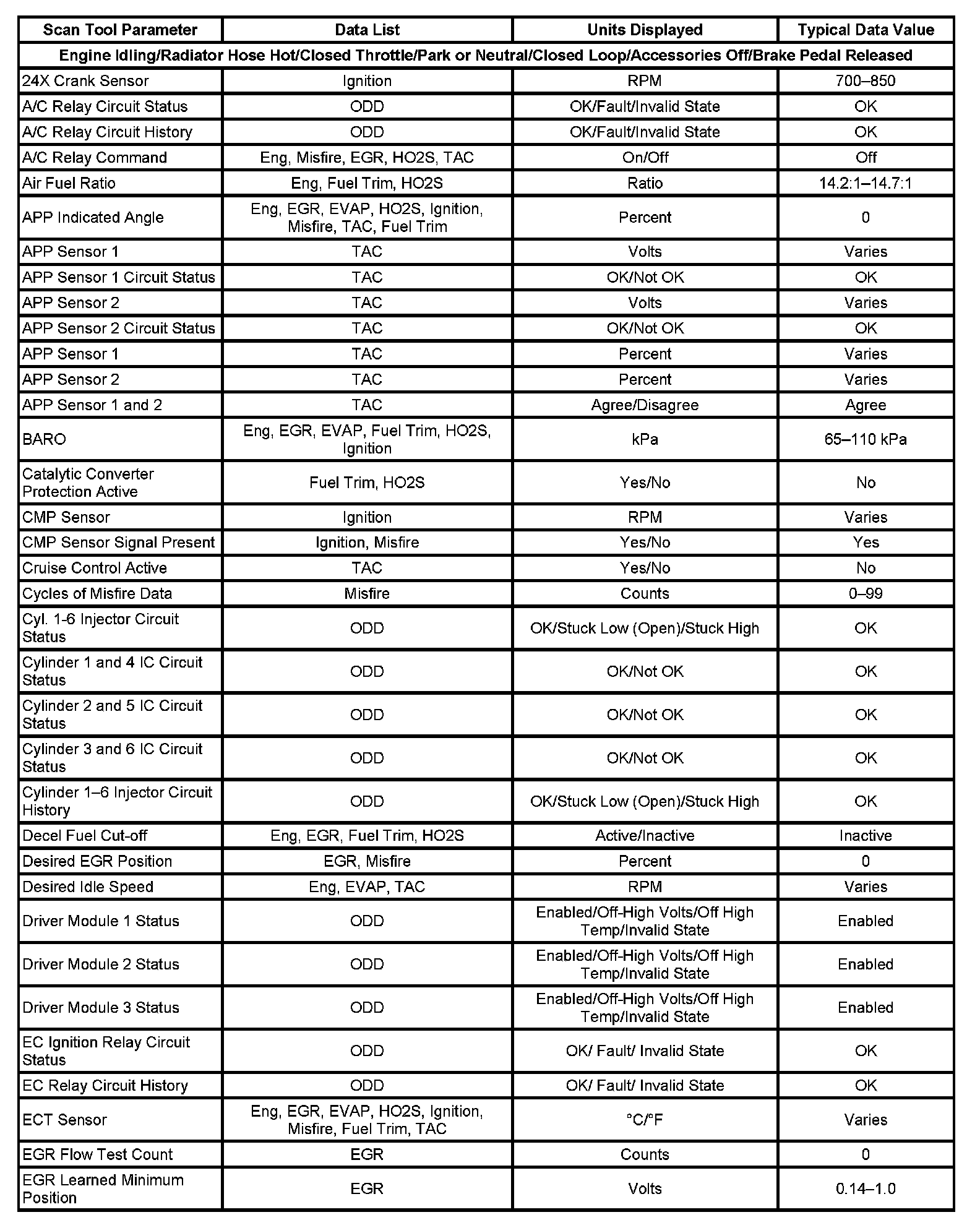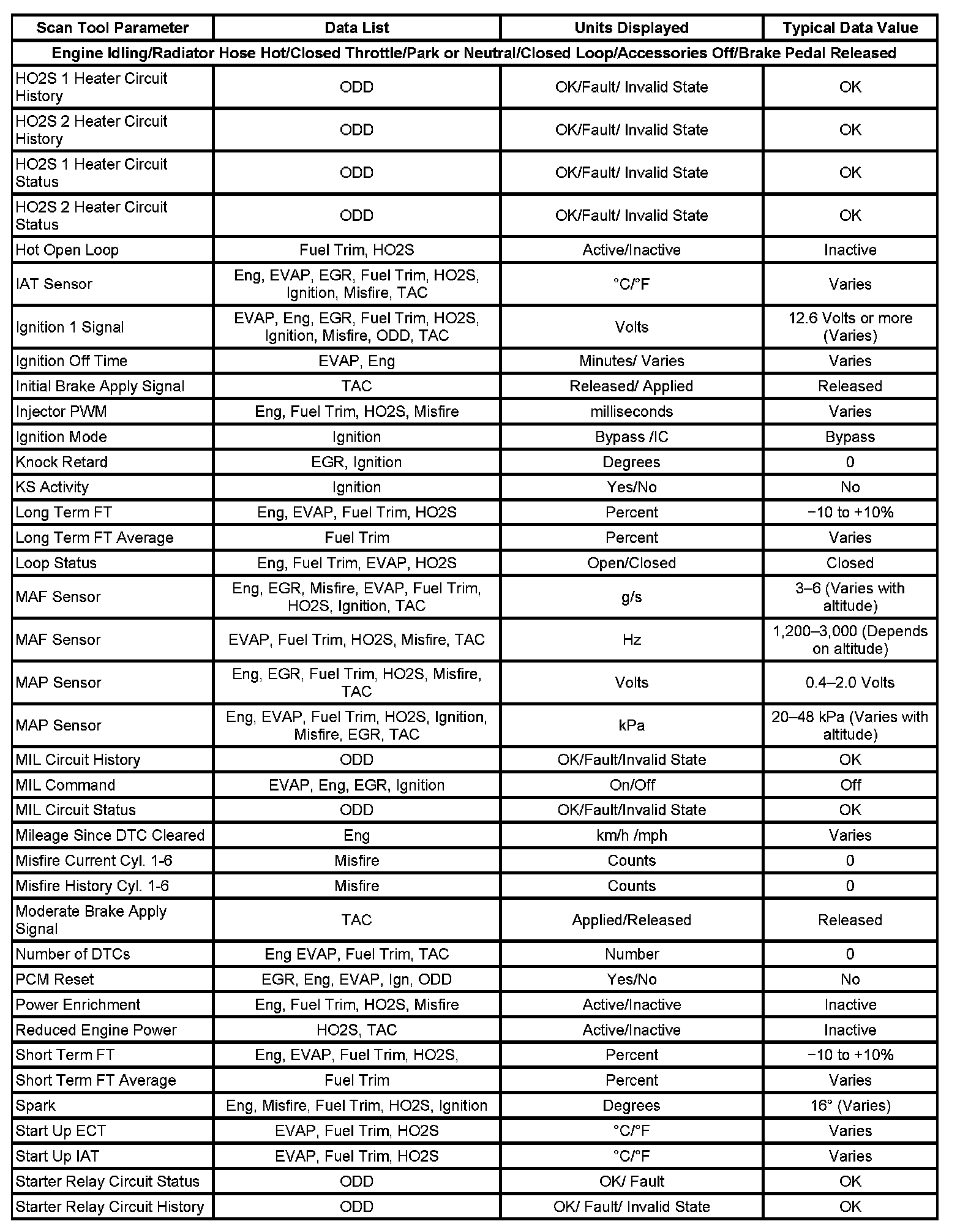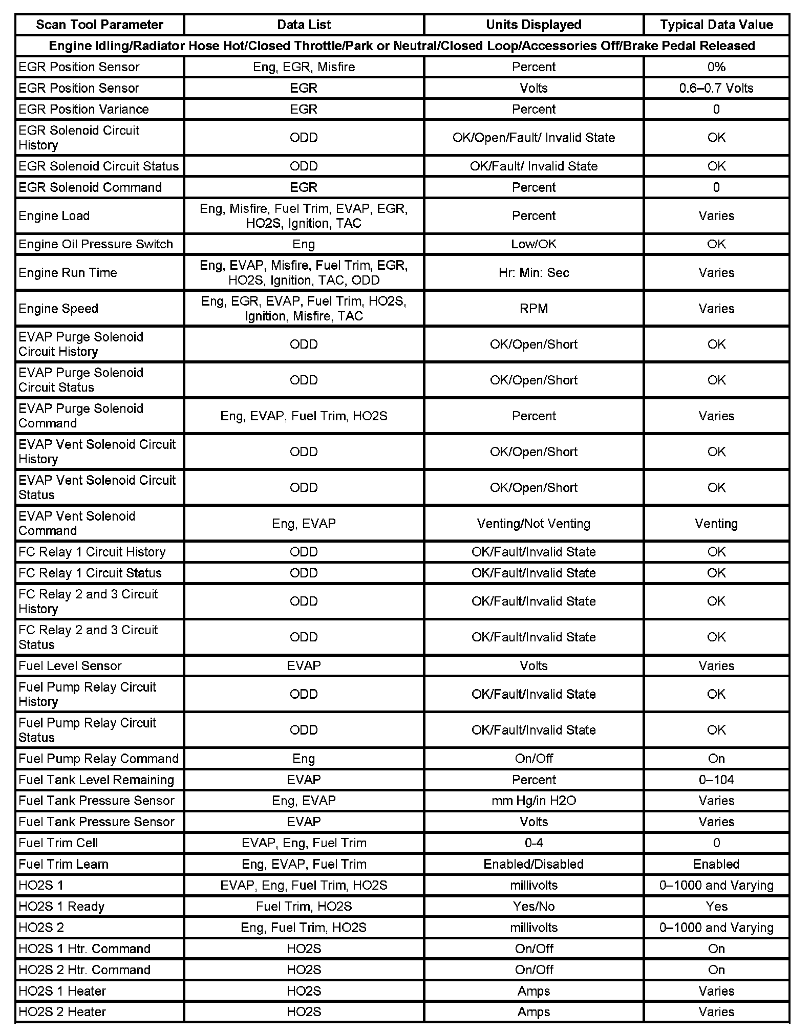The Engine Scan Tool Data List contains all engine-related parameters that are available on the scan tool. The list is arranged in alphabetical order. A given parameter may appear in any one of the data lists, and in some cases may appear more than once, or in more than one data list in order to group certain related parameters together.