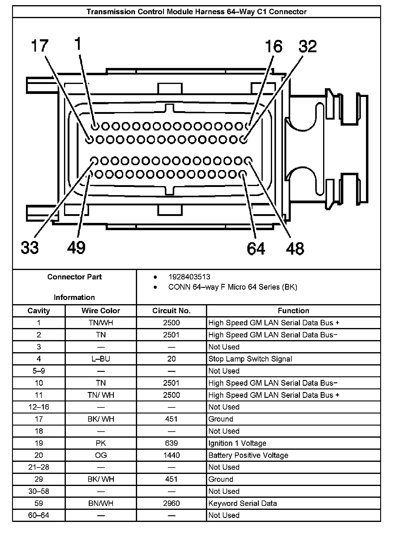 Transmission Control Module Harness 64-Way C1 Connector: