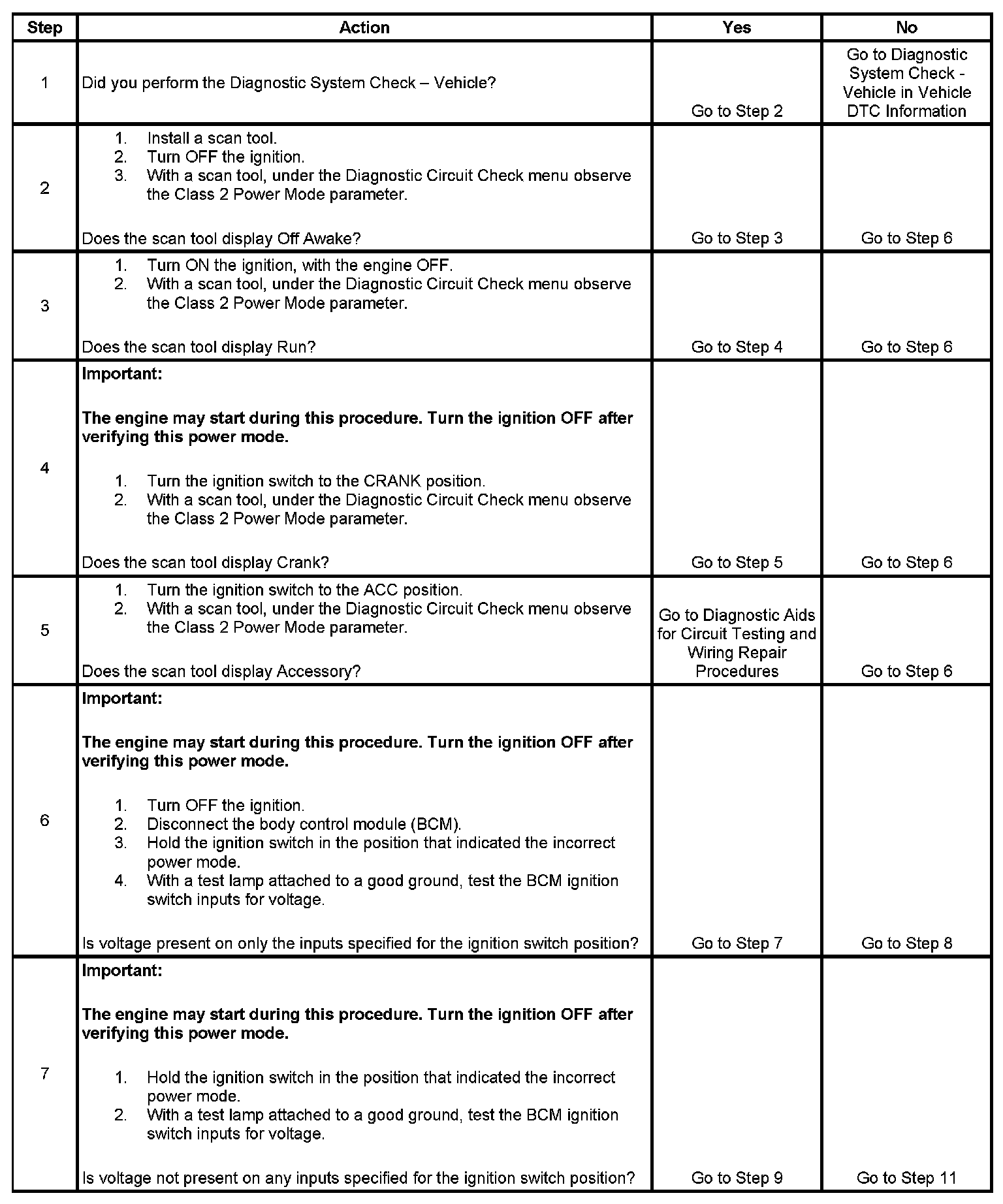The numbers below refer to the step numbers on the diagnostic table.