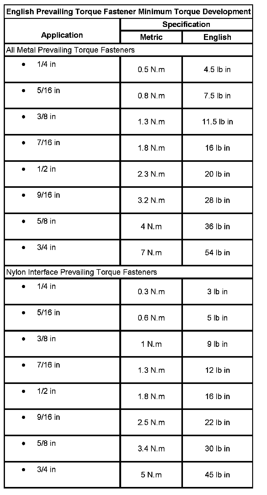 ENGLISH PREVAILING TORQUE FASTENER MINIMUM TORQUE DEVELOPMENT