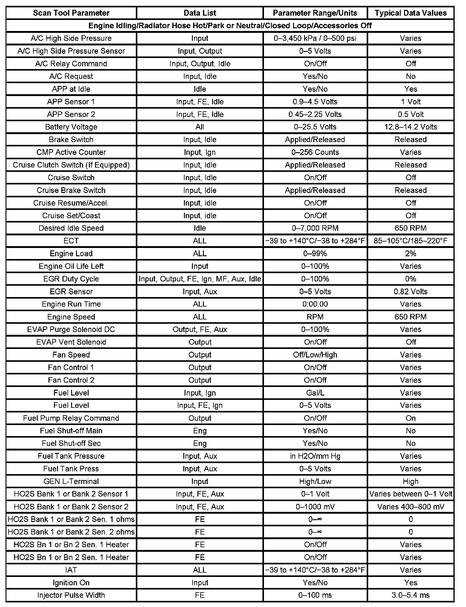 The Engine Scan Tool Data List contains all engine related parameters that are available on the scan tool. The list is arranged in alphabetical order. A parameter may appear in any one of the data lists, and in some cases may appear more than once, or in more than one data list in order to group certain related parameters together.