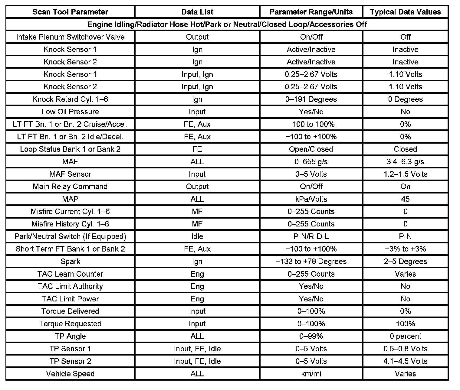 Scan tool values from a properly running engine may be used for comparison with the engine you are diagnosing. The Engine Scan Tool Data List represents the values that would be seen on a normal running engine.