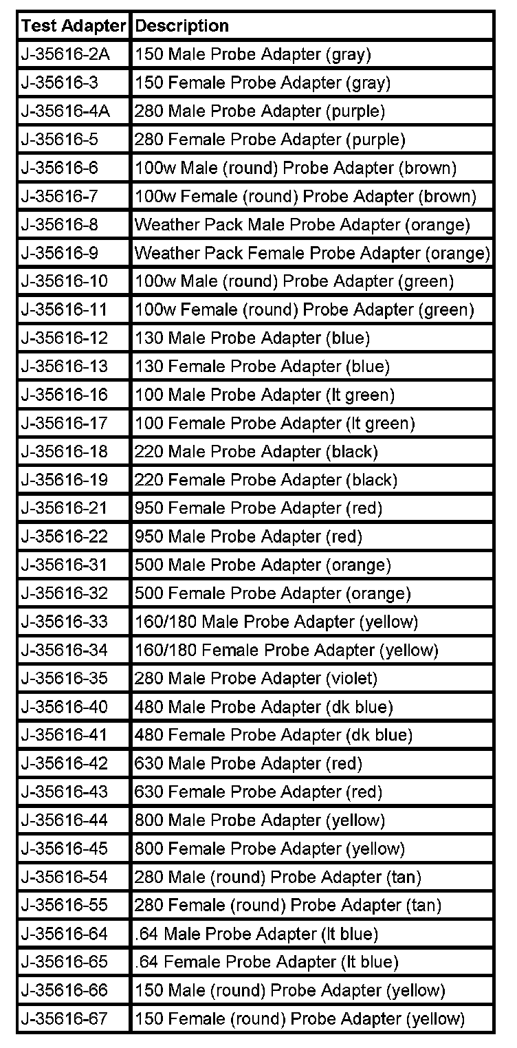 When using the J 35616 GM-Approved Terminal Test Kit, ensure the terminal test adapter choice is the correct size for the connector terminal. Do not visually choose the terminal test adapter because some connector terminal cavities may appear larger than the actual terminal in the cavity. Using a larger terminal test adapter will damage the terminal. Refer to the J 35616 GM-Approved Terminal Test Kit label on the inside of the J 35616 GM-Approved Terminal Test Kit for the correct adapter along with the connector end view for terminal size. Refer to the following table as guide in selecting the correct test adapter for frontprobing connectors: